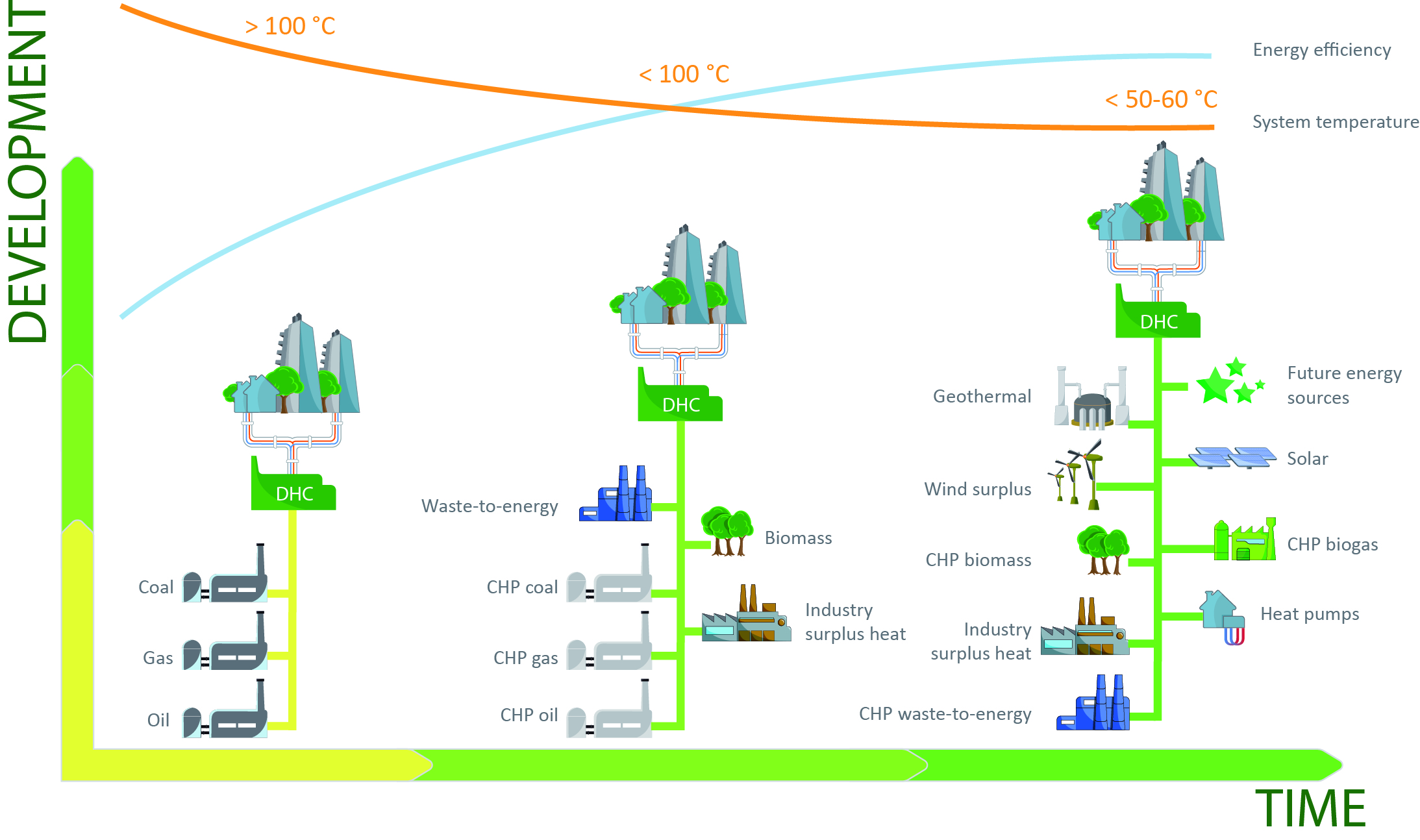Over the last decades, DH systems have been developed by introducing new technologies and by increasing energy efficiency. These changes have had a wide range of consequences which resulted in four different generations of DH systems in terms of technology, heat distribution, medium, circulation systems etc. Starting from the 1st generation where the heat carrier was steam, the last, 4th generation of DH provides low temperature DH systems with water at 30-60°C, depending on requirements. Apart from the heat carrier, circulation systems have changed from steam pressure and central pumps only to more sophisticated central and decentralised pumps. Another important development can be found in substations and radiators (heat exchangers) where floor heating and low-temperature radiators will be used.